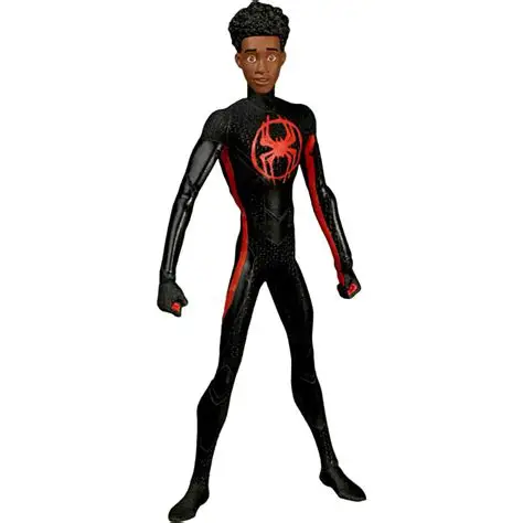 La figura de Miles Morales Spider-Man de Mezco Toyz destaca por su nivel de detalle excepcional, inspirado directamente en su apariencia en la película. Desde el traje negro y rojo con textura realista hasta las proporciones dinámicas del personaje, cada elemento ha sido cuidadosamente diseñado para ofrecer una representación fiel y espectacular 🕸️✨.