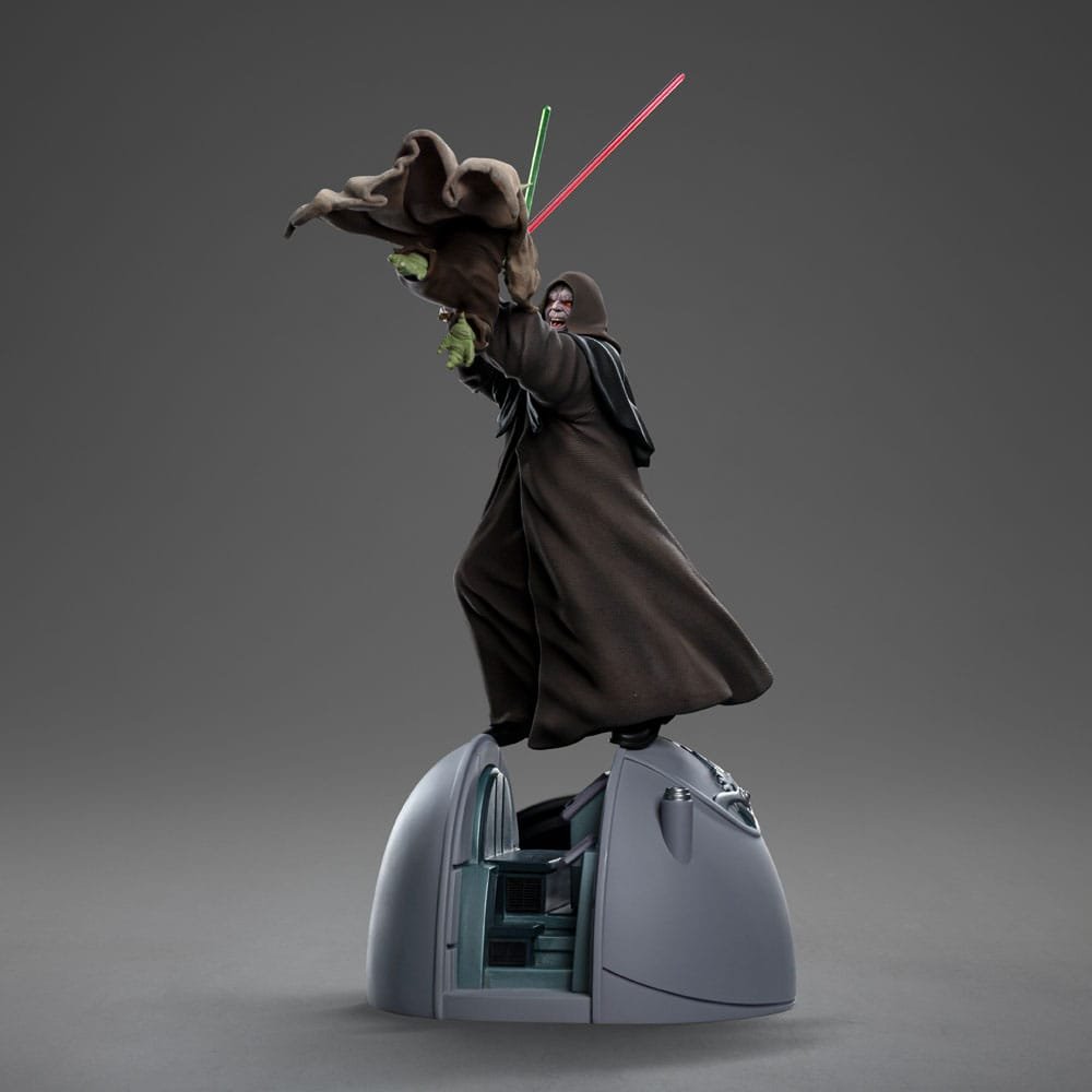 Inspirada en la inolvidable batalla en el Senado Galáctico entre el Maestro Jedi Yoda y el temido Emperador Palpatine (Darth Sidious) en Star Wars: Episodio III – La Venganza de los Sith, esta estatua en escala 1/10 de Iron Studios recrea con realismo cinematográfico uno de los momentos más intensos y simbólicos del conflicto entre la luz y el lado oscuro de la Fuerza.