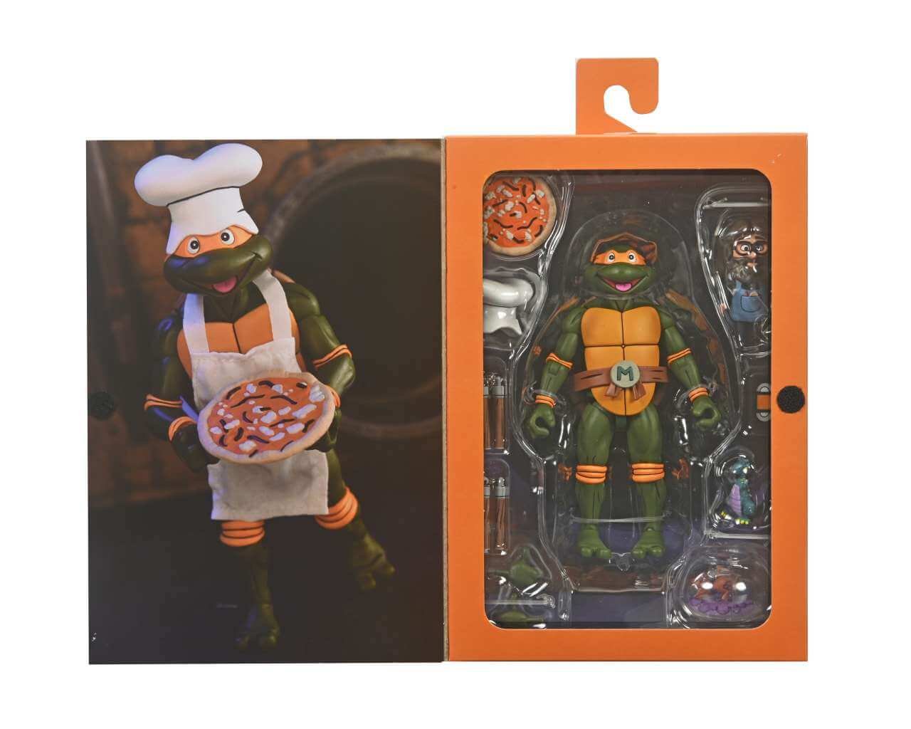 Contiene 1x gorro de cocinero, 1x delantal, 1x par de manos, 1x pizza, 2x nunchakus, 1x cinta VHS, 1x mini dragón, 1x pez en su pecera y 1x compañero del Pizza Club.